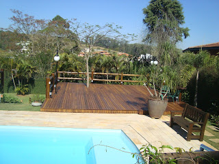 Aproveitamento de espaço em talude de aproximadamente 3,00 mts de altura. Deck medindo 80,00 m2, com guarda-corpo de 1,10 h. Barroteamento em eucalipto bruto tratado em autoclave, com garantia d ausina de 15 anos e réguas de ipê cumaru de 0, 10 cm, acabamento em Osmocolor natural.